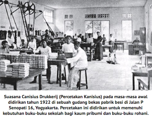 Canisius Drukkerij, yang selanjutnya lebih dikenal dengan nama Penerbit-Percetakan Kanisius, berdiri pada 26 Januari 1922 atas inisiatif Superior Misi Pastor J. Hoeberechts, SJ. Diawali dengan sebuah percetakan kecil yang mencetak buku-buku untuk kepentingan peribadatan Gereja dan buku-buku pendidikan untuk memenuhi kebutuhan murid-murid sekolah pribumi di Yogyakarta, Percetakan Kanisius turut mendukung gerakan pers perjuangan dengan mencetak majalah, surat kabar, dan media baca lain penggugah semangat nasionalisme. Pada permulaan operasinya, manajemen Percetakan Kanisius dipercayakan kepada bruder-bruder FIC. Hanya dengan menggunakan satu mesin cetak dan segelintir orang pekerja, Bruder Bellinus merintis perusahaan ini di sebuah bangunan kecil bekas gudang di kompleks sekolah milik Bruderan FIC Kidul Loji.