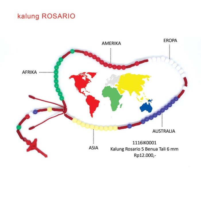 Kalung rosario terbuat dari manik-manik plastik berukuran 6 mm yang dirangkai dengan tali berbandul salib logam berukuran kecil.