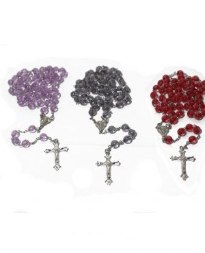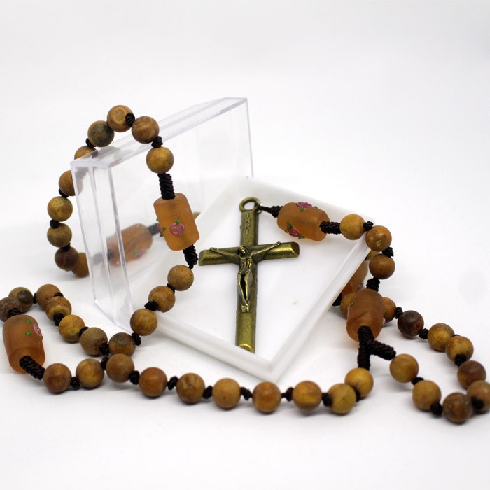 Kalung Rosario Batu Kayu Lilit Bead Tabung, biji terbuat dari batu bercorak berukuran 7 mm yang dihubungkan dengan tali. Pada pembatas biji ke 10 diberikan batas batu berberbentuk tabung. Salib terbuat dari besi logam berukuran 3,5×7 cm. Dilengkapi kotak rosario berukuran 5×8,5 cm