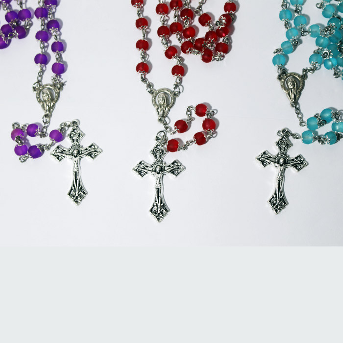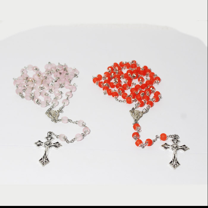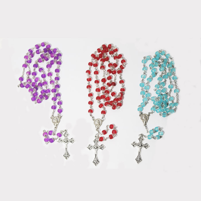 Kalung rosario dengan manik-manik terbuat dari kristal sintetis berukuran 6 mm yang dihubungkan atau dirangkai dengan rantai, berbandul salib logam berukuran kecil, tersedia dalam warna hijau, orangnya,merah, ungu, biru