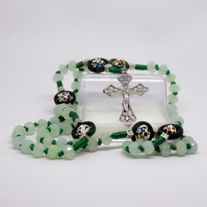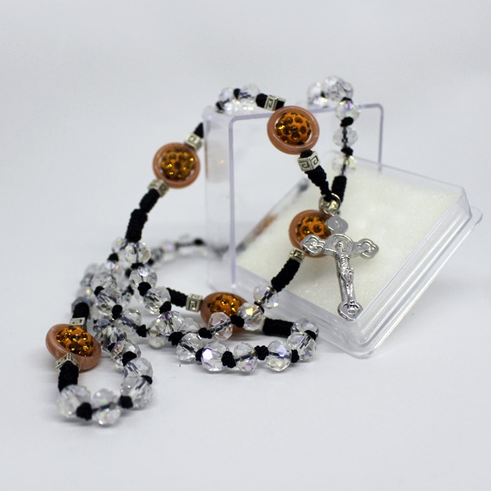 Rosario Kristal Lilit Donat Rondel Bola Mata, biji terbuat dari kristal bening 7 mm yang dihubungkan dengan tali. Pada setiap batas 10 biji diberikan batas hiasan bola mata Salib cahaya terbuat dari besi logam berukuran 3×4,5 cm. Dikemas dalam kotak rosario berukuran 5,5×5,5 cm