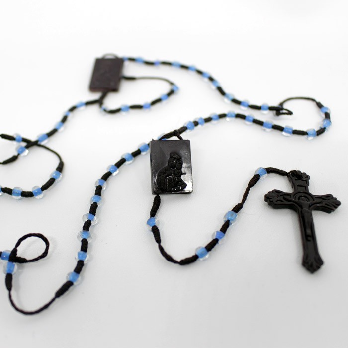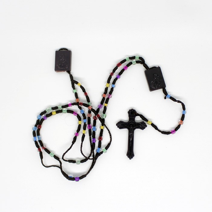 Kalung Rosario Skapulir dari manik-manik berukuran 6 mm terbuat plastik dengan beberapa pilihan warna terang antara lain biru, hijau, dan merah. Skapulirnya terbuat dari plastik.