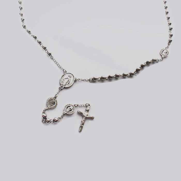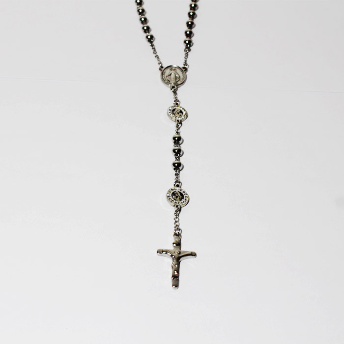Kalung Rosario Titanium dengan manik-manik berbentuk bulat berukuran 6mm yang dihubungkan/ dirangkai menggunakan rantai. Berbandul salib dan medali wasiat Maria. Terbuat dari titanium berwarna silver.