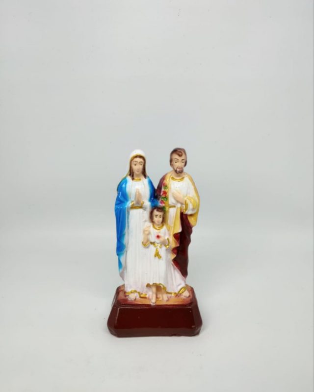 Patung Keluarga Kudus menggambarkan sosok kanak-kanak Yesus dengan Maria dan Yosef yang mengajarkan keteladanan dalam hal iman, kesetiaan, pengorbanan, pelayanan, kesederhanaan dan ketergantungan secara penuh dan total pada Allah sebagai kekuatan dan andalannya. Patung terbuat dari bahan fiber berukuran 5,5×10 cm.