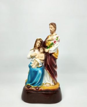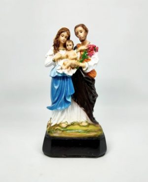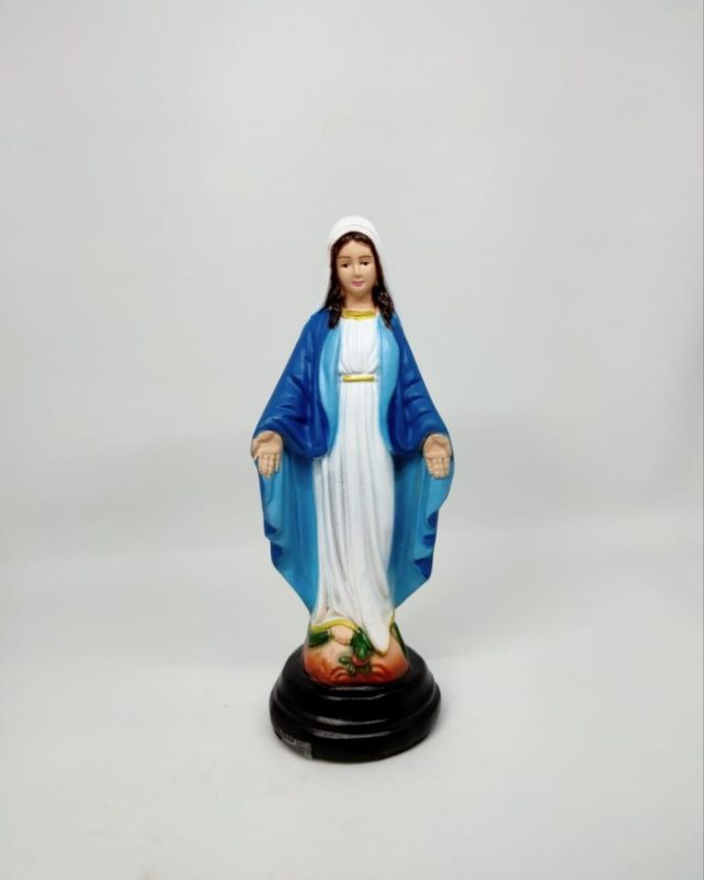 Patung Maria tangan terbuka terbuat dari bahan fiber berukuran 5,5 x 15 cm menampilkan sosok Maria dengan jubah warna dominan biru.